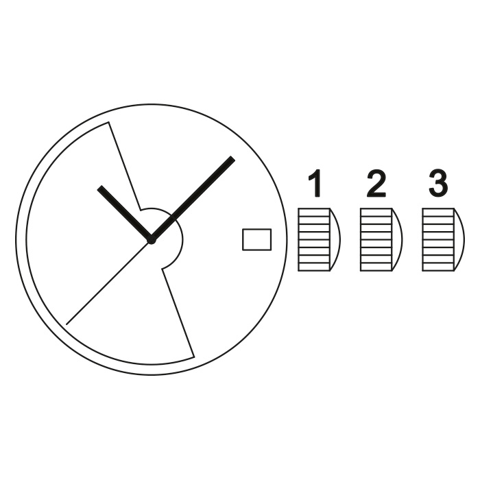 3 hands, Central hour hand, Central minute hand, Central second hand, Date window at 3:00 |